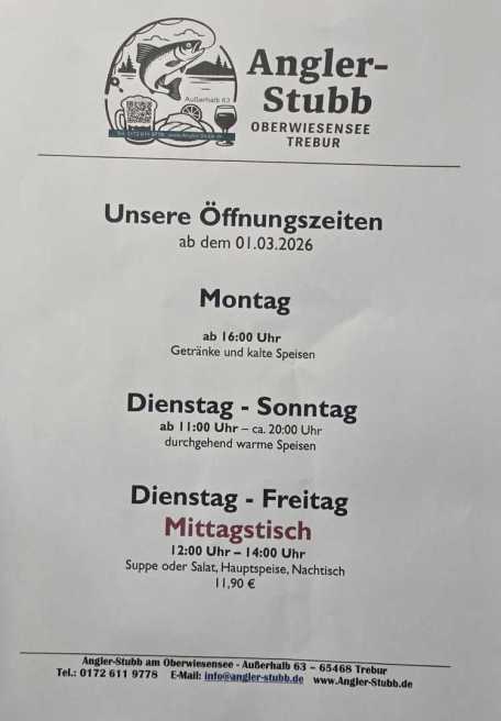 | Montags ab 16.00 Uhr Getränke und kalte Speisen Dienstag bis Freitag Mittagstisch von 12.00 bis 14.00 Uhr Dienstag bis Sonntag ab 11.00 Uhr bis ca. 20.00 Uhr durchgehend warme Speisen. Wir freuen uns auf euren Besuch! | |